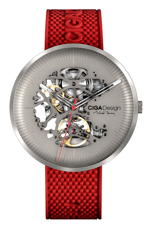 CIGA Design Michael Young Series Titanium Automatic Skeleton M031-TITI-W15RE on tyylikäs luurankokello automaattikoneistolla. Muotoilija Michael Young käsialaa, tämän titaanikellon 41 mm leveä ja 12 mm paksu runko on valmistettu hopeanvärisestä titaanista. Materiaalina titaani on paitsi erittäin kestävää, se on myös hyvin kevyttä, jonka vuoksi tämä kello on erittäin miellyttävä ranteessa. Pakkauksessa toimitetaan irrallisena kaksi ranneketta (kumpikaan ei rungossa kiinni): punainen silikoniranneke (145 - 230 mm) ja musta krokotiliikuvioitu nahkaranneke (160 - 215 mm). Koneistona kellossa on 25-kivinen SEAGULL ST2551JK Automatic 40 tunnin käyntivaralla. Skeleton-kellotaulun suojana on safiirilasi, jonka läpi voit ihastella kellon koneiston toimintaa, ja myös takalasi on avonainen tehden tästä kellosta täysin läpikuultavan. Luettavuuden parantamiseksi kellon viisarien päät on luminoitu. Kello kuuluu 3 ATM -vesitiiviysluokkaan, eli se on roiskevesitiivis. CIGA Design -kelloille myönnetään yhden vuoden takuu, ja ne toimitetaan valmistajan alkuperäisissä pakkauksissa.