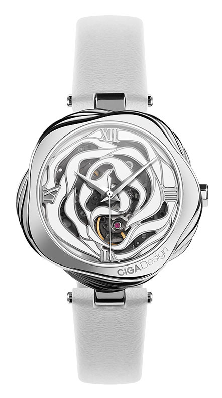 CIGA Design R Series Danish Rose Automatic Skeleton R022-SISI-W1 on kaunis luurankokello, joka on tanskalaisen muotoilijan Anders Ellegaardin käsialaa. Tämä ruususta inpiraationsa saanut kello on 39,5 mm leveä ja 9,4 mm paksu, ja runko on valmistettu hopeanvärisestä 316L kirurginteräksestä. Ruusua muistuttava taulu on yhdistetty valkoiseen nahkarannekkeeseen, jonka leveys kiinnityskohdasta on 16 mm. Koneistona kellossa on 25-kivinen Miyota 90S5 Automatic 42 tunnin käyntivaralla. Skeleton-kellotaulun suojana on safiirilasi, jonka läpi voit ihastella kellon koneiston toimintaa. Pakkaus sisältää myös yhteensopivan kaulakorun, jota koristaa Svarowskin kristalli. Kello kuuluu 3 ATM -vesitiiviysluokkaan eli se on roiskevesitiivis. CIGA Design -kelloille myönnetään yhden vuoden takuu, ja ne toimitetaan valmistajan alkuperäisissä pakkauksissa.