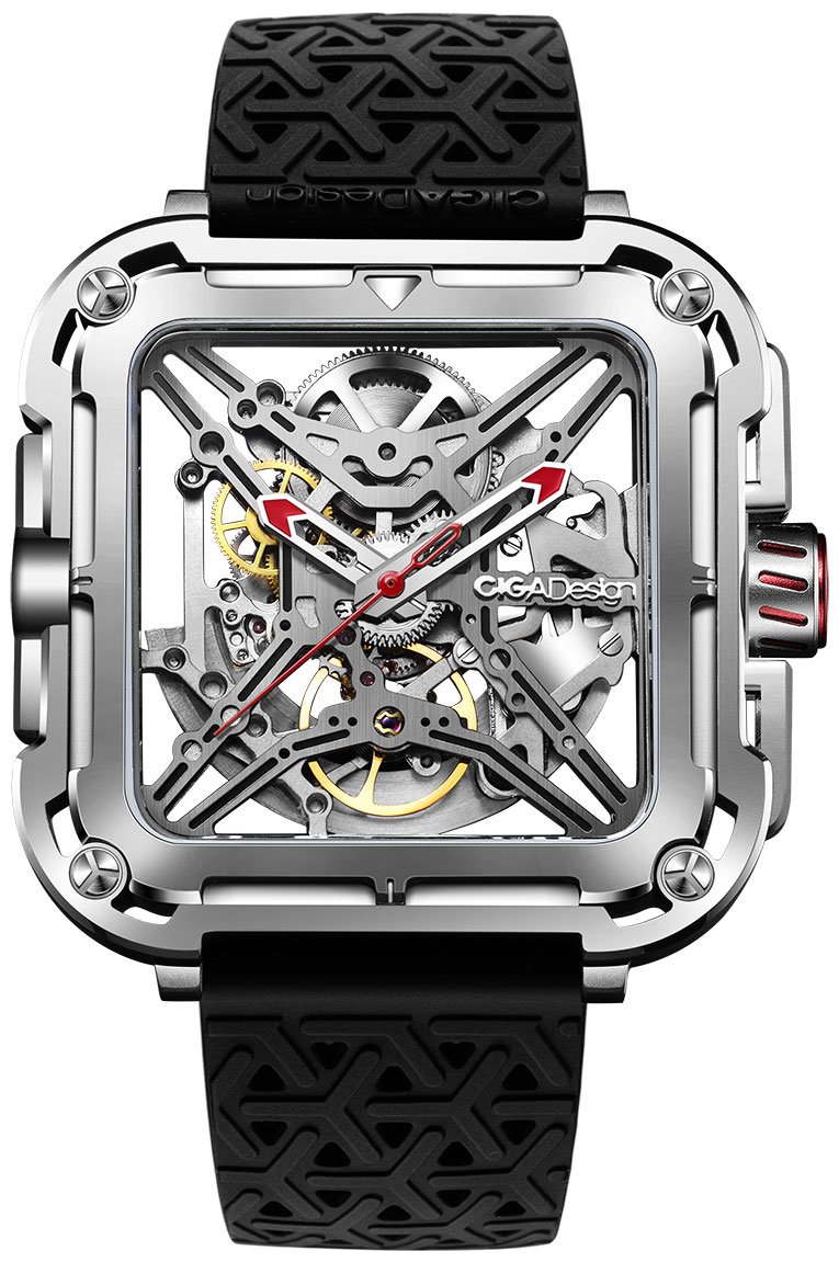 CIGA Design X Series Space Silver Automatic Skeleton X011-SISI-W25BK on tyylikäs luurankokello automaattikoneistolla. Kellon 44 mm leveä ja 48 mm korkea runko on valmistettu hopeanvärisestä ruostumattomasta teräksestä. Kellossa on musta silikoniranneke, jonka leveys kiinnityskohdasta on 22 mm. Mukana toimitetaan myös musta nailonranneke. Koneistona kellossa on 25-kivinen CIGA Design CD-01 Automatic 40 tunnin käyntivaralla. Skeleton-kellotaulun suojana on safiirilasi, jonka läpi voit ihastella kellon koneiston toimintaa. Kello kuuluu 3 ATM -vesitiiviysluokkaan eli se on roiskevesitiivis. CIGA Design -kelloille myönnetään yhden vuoden takuu, ja ne toimitetaan valmistajan alkuperäisissä pakkauksissa.