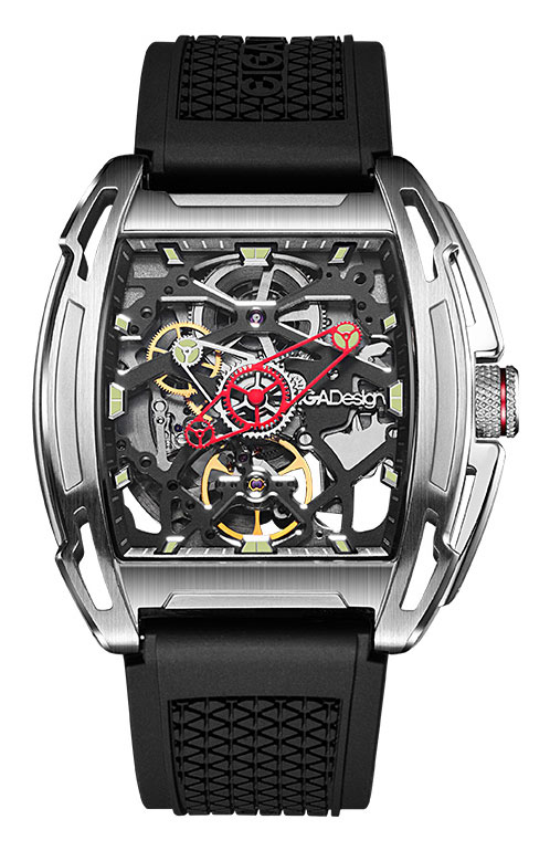 CIGA Design Z Series Exploration Automatic Skeleton Z062-SISI-W5BK on tyylikäs luurankokello automaattikoneistolla. Kellon 41,7 mm leveä ja 48 mm korkea tonneau-runko on valmistettu hopeanvärisestä 316L-kirurginteräksestä. Kellossa on musta silikoniranneke, jonka leveys kiinnityskohdasta on 22 mm. Koneistona kellossa on 25-kivinen SEAGULL ST2553JK Automatic 40 tunnin käyntivaralla. Skeleton-kellotaulun suojana on safiirilasi, jonka läpi voit ihastella kellon koneiston toimintaa. Kello kuuluu 3 ATM -vesitiiviysluokkaan eli se on roiskevesitiivis. CIGA Design -kelloille myönnetään yhden vuoden takuu, ja ne toimitetaan valmistajan alkuperäisissä pakkauksissa.