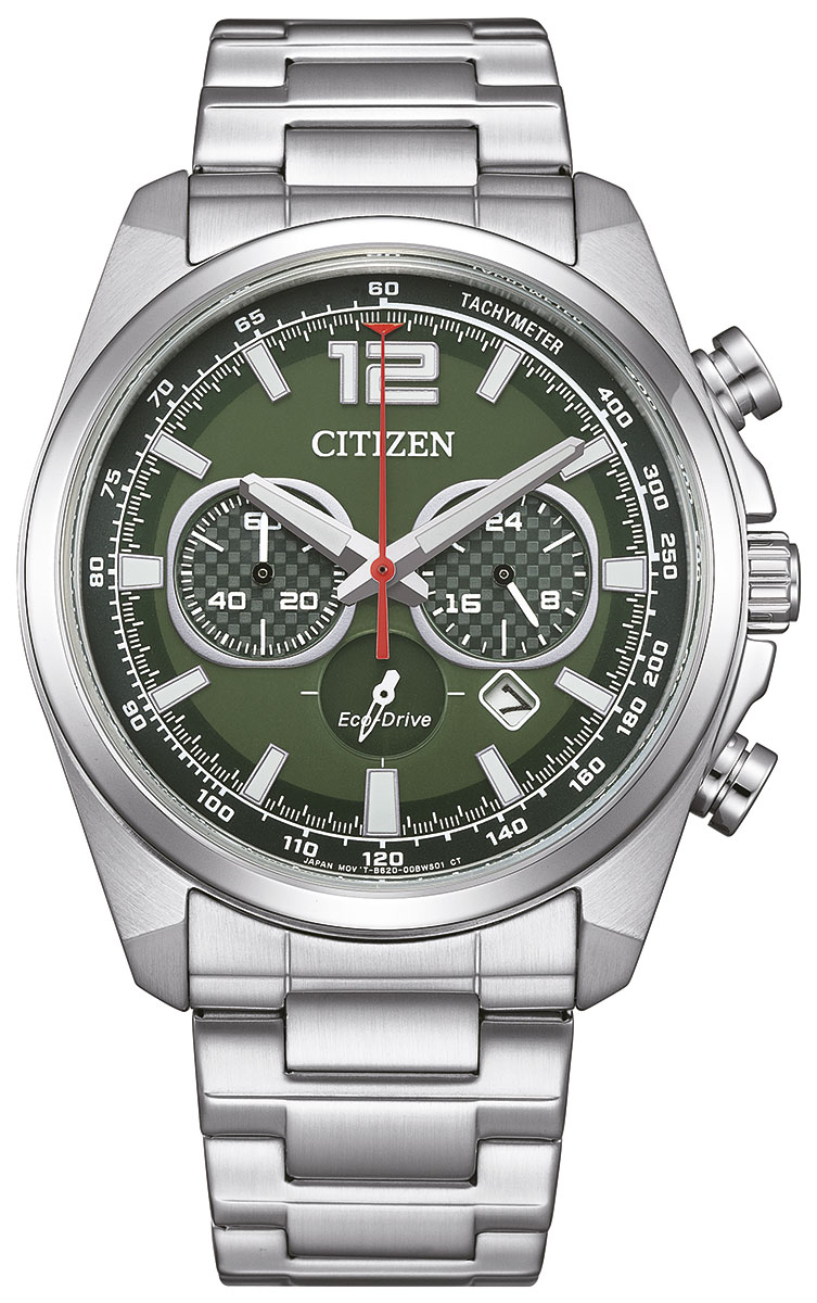 Citizen Eco-Drive Chronograph CA4640-50X on laadukas miesten kronografikello, jonka Eco-Drive-koneisto toimii auringonenergialla ja sen tehoreservi on n. 9 kuukautta täyteen ladattuna. Kellon runko on valmistettu ruostumattomasta teräksestä, joka on leveydeltään 41 mm ja paksuudeltaan 12 mm. Kestävä mineraalilasi suojaa vihreää kellotaulua, jossa on akun varauksen ilmaisin, kronografitoiminnoille alataulut, ja sekuntikello tallentaa aikaa maksimissaan 60 minuuttia. Päivyri löytyy klo 4 ja 5 väliltä ja luminoidut viisarit ja indeksit loistavat pimeässä, helpottaen kellotaulun lukemista. Citizen Eco-Drive Chronograph CA4640-50X kokonaispaino on 143 grammaa ja se kuuluu vesitiiviysluokkaan 100m / 10atm eli se soveltuu pintauintikäyttöön ja snorkkelisukellukseen.