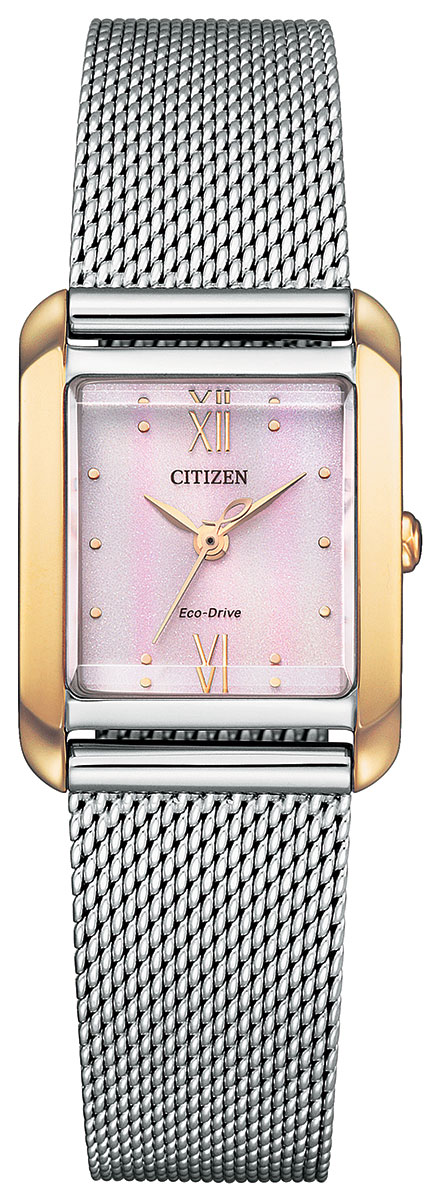 Citizen Eco-Drive EW5596-66X -kellossa on 21,5 mm leveä ja 7,5 mm paksu ruostumaton teräsrunko. Runkoon kiinnittyy hopeanvärinen mesh-ranneke. Pakkauksen mukana toimitetaan vaaleanpunainen ECOPET®-nahkaranneke, joka on vastuullisesti valmistettu kierrätetyistä materiaaleista. Safiirilasin alla suojassa on vaaleanpunainen kellotaulu. Kellossa on B035-kaliiberin Eco-Drive-koneisto. Koneisto ottaa virtansa valosta ja kestää täyteen ladattuna jopa 210 päivää. Erillisiä paristoja ei siis tarvita. Kellon ominaisuuksiin kuuluu alhaisen varaustason hälytin ja ylilatauksen estotoiminto. Citizen EW5596-66X -kellon vesitiiviysluokka on 50m / 5atm eli se on rajoitetusti vesitiivis (uintia ei suositella). Citizen-kelloilla on kahden vuoden takuu, jonka voit pidentää kolmeen vuoteen rekisteröimällä Citizen-kello -sivulla .