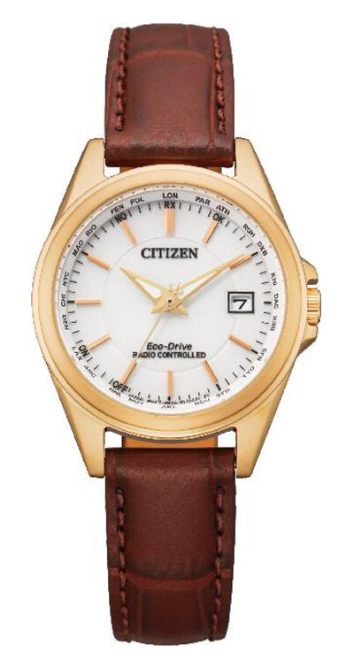 Naisten Citizen Eco-Drive Radio controlled EC1183-16A -kello on vaivaton ja kestävä teräskello kauniilla ruskealla nahkarannekkeella. Radiokontrollin avulla kello pysyy aina ajassa riippumatta siitä mistä kellon käyttäjä itsensä löytää. Kellossa on tyylikäs 29 mm leveä täysteräksinen, kullanvärinen runko, ja radiokontrolloitu koneisto vastaanottaa aikasignaalin radiotaajuudella (atomikellon tarkkuus on +-1 s. / 1 miljoonassa vuodessa), joten se pysyy aina sekunnilleen oikeassa ajassa siirtyen myös automaattisesti kesä- ja talviaikaan. Tarkan aikansa lisäksi kellossa on valosta virtansa ottava H246-kaliberin eco-drive-koneisto, jonka käyntivara on täyteen ladattuna 180 päivää, joten virran loppumisesta tai paristonvaihdosta ei tarvitse huolehtia. Citizen-kelloilla on kahden vuoden takuu, jonka voit pidentää kolmeen vuoteen rekisteröimällä Citizen-kello -sivulla .