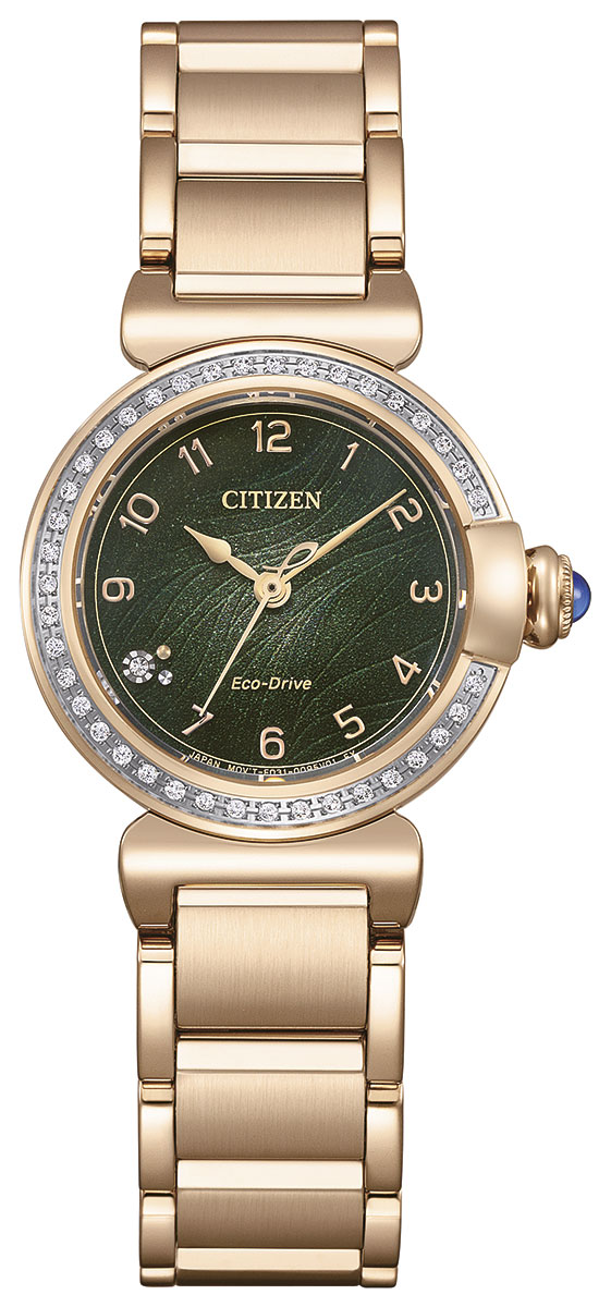 Citizen Eco-Drive Round Collection Diamond EM1123-62X on elegantti naisten rannekello, jonka säväyttävä 39 timantilla koristeltu kehys on sekä silmäänpistävä että ensiluokkainen. Kellossa on lisäksi sininen lasi-keraaminen kruunu tuomassa lisätyyliä. Kello saa energiaa kestävästi millä tahansa valolla patentoidulla Eco-Drive-teknologialla, jossa on 180 päivän käyntivara, joka ei tarvitse akkua. Kello on valmistettu ruostumattomasta teräksestä, jonka runko on leveydeltään 26 mm ja paksuudeltaan 8,1 mm. Naarmuilta suojaava safiirilasi suojaa kierrätysmateriaaleista valmistettua vihreää kellotaulua, jossa on selkeät numeroindeksit ja sekunti-, minuutti ja tuntiviisarit. Kellotaulun upean ulkomuodon viimeistelee kiiltävä timantti kello 8 kohdalla. Kello kuuluu vesitiiviysluokkaan 50m / 5atm eli se on rajoitetusti vesitiivis (uintia ei suositella). Citizen Eco-Drive Round Collection Diamond EM1123-62X on tehokkaalla suorituskyvyllä varustettu täydellinen lisävaruste, ja se toimitetaan pakkauksessa, jossa on vaihdettava ruskea nahkaranneke.