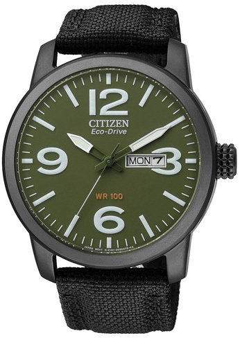Citizen Eco-Drive Pilot BM8476-07E rannekello. Tyylikäs pilottikello mustalla rungolla, vihreallä kellotaululla ja kangasrannekkeella. Kellon rungon leveys 42mm ja rannekkeen 22mm. Citizen Eco-Drive- kellot toimivat valon voimalla ja lataavat käyntivirtaa ympäristöystävälliseen titaani-litium-ioni-akkuun. Yhden vuorokauden käyntiin tarvittava sähköenergia saadaan pitämällä kelloa pari minuuttia valossa. Citizen kelloille myönnetään 2 vuoden takuu ja ne toimitetaan valmistajan alkuperäisessä rasiassa.
