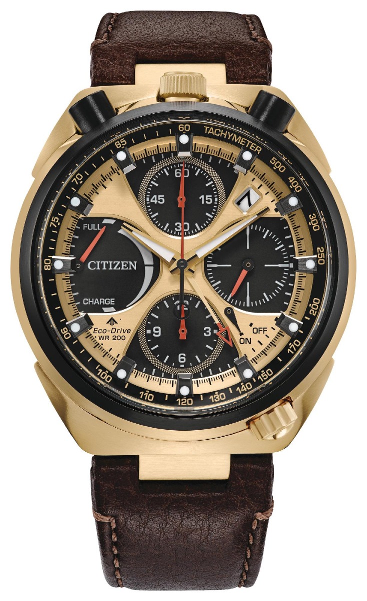 Ilmeensä tämä hyvin ainutlaatuinen kello on saanut vuoden 1973 Citizenin kellosta, jonka fanit nopeasti kastoivat nopeasti nimellä "bullhead", koska kellon painikkeet sijaitsivat kellon päällä eikä sivussa. Tämä kultaa, mustaa ja ruskeaa nahkaa sisältävä rannekello onkin ilmeeltään täysin ainutlaatuinen ja täydellinen uniikkia kelloa etsivälle. Kellon 45 mm leveässä rungossa on neljä erillistä näyttöä ajanotolle, akun varaustasolle, ja hälytykselle. Päivyri löytyy kello yhdestä, ja taulua reunustaa takometri. Kellon flyback-kronografi mittaa aikaa 1/5 sekunnin tarkkuudella 12 tuntiin saakka. Taulua suojaa heijastuksen-estolla varustettu safiirilasi. Citizen Promaster Eco-Drive Tsuno Chronograph Racer Limited Edition AV0072-01X race-kello toimitetaan omassa alkuperäisrasiassaan. Citizen-kelloilla on kahden vuoden takuu, jonka voit pidentää kolmeen vuoteen rekisteröimällä Citizen-kello -sivulla .