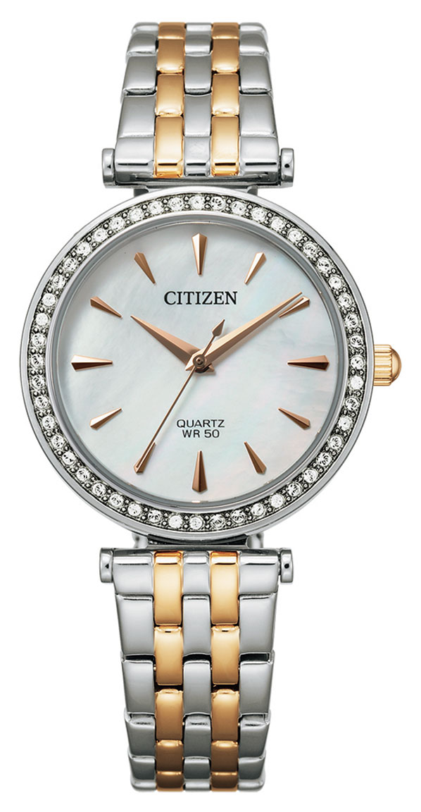 Citizen Quartz ER0210-55Y on tyylikäs naisten rannekello. Kellossa on ruostumattomasta teräksestä valmistettu 30 mm leveä ja 6,7 mm paksu runko. Painoa kellolla on 57 grammaa. Rannekkeena tässä mallissa on kaksivärinen teräsranneke. Tyylikästä helmiäiskellotaulua suojaa mineraalilasi. Kellon vesitiiviysluokitus on 50m / 5atm, joka tarkoittaa, että kello on rajoitetusti vesitiivis. Citizen-kelloille myönnetään 2 vuoden takuu ja ne toimitetaan valmistajan alkuperäisessä pakkauksessa.