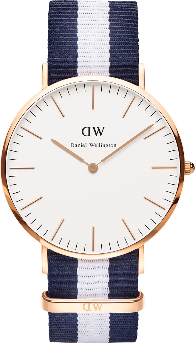 Miesten Daniel Wellington Classic Glasgow 0104DW rannekello värikkäällä kangasrannekkeella ja punakullan väriseksi pinnoitetulla rungolla. Kellon rungon leveys on 40mm ja paksuus vain 6mm, joten kelloa on todela miellyttävä pitää ranteessa. Pehmeän kangasrannekkeen leveys on 20mm. Daniel Wellington kellot toimitetaan valmistajan alkuperäisessä rasiassa ja niille myönnetään 2 vuoden takuu.