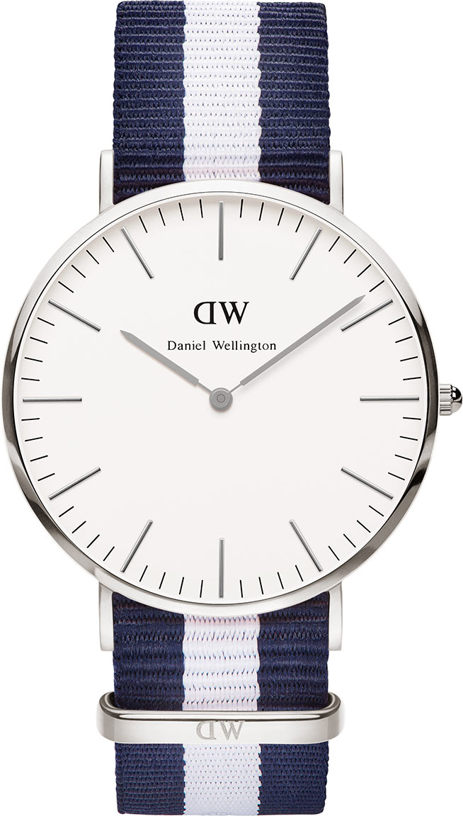 Miesten Daniel Wellington Classic Glasgow 0204DW rannekello värikkäällä kangasrannekkeella ja teräksen värisellä rungolla. Kellon rungon leveys on 40mm ja paksuus vain 6mm, joten kelloa on todela miellyttävä pitää ranteessa. Pehmeän kangasrannekkeen leveys on 20mm. Daniel Wellington kellot toimitetaan valmistajan alkuperäisessä rasiassa ja niille myönnetään 2 vuoden takuu.