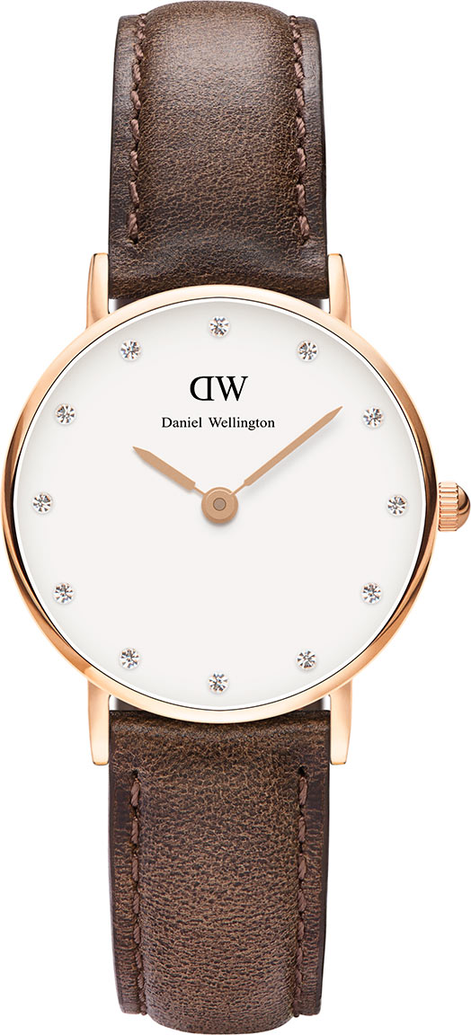 Naisten tyylikäs Daniel Wellington Classy Cardiff 0904DW rannekello nahkarannekkeella ja punakullan väriseksi pinnoitetulla rungolla. Kellotauluun on kiinnitetty kauniita Swarovskin kristalleja. Kellon ruostumattomasta teräksestä valmistetun rungon leveys on 26mm ja paksuus vain 6mm, joten se on todella ohut ja mukava pitää ranteessa. Aidosta nahkasta valmistetun rannekkeen leveys on 14mm. Daniel Wellington kellot toimitetaan valmistajan alkuperäisessä rasiassa ja niille myönnetään 2 vuoden takuu.
