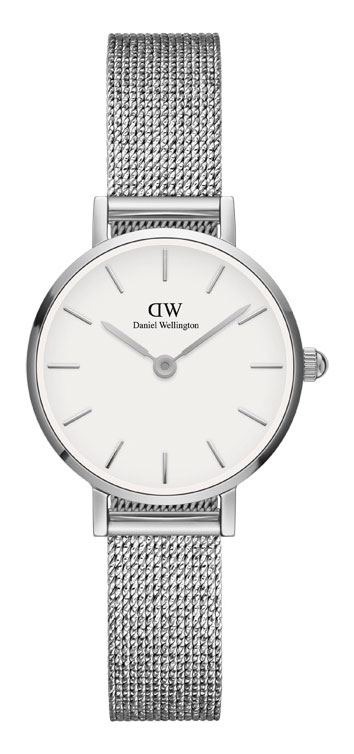 Daniel Wellington Petite 24 Pressed Sterling Silver White DW00100442 on elegantti naisten rannekello. Kyseessä on tähän mennessä pienin DW-kello. Daniel Wellington DW00100442 -kellon hopeanvärinen 24 mm leveä ja 6 mm paksu runko on valmistettu ruostumattomasta teräksestä. Kellossa on Daniel Wellingtonin uusi 10 mm leveä hopeanvärinen Pressed Mesh -ranneke, jonka kimalteleva tekstuuri antaa rannekkeelle tyylikästä ulkonäköä. Mineraalilasin alla suojassa on valkoinen kellotaulu. Daniel Wellington -kelloille myönnetään 2 vuoden takuu ja ne toimitetaan valmistajan alkuperäisessä rasiassa.