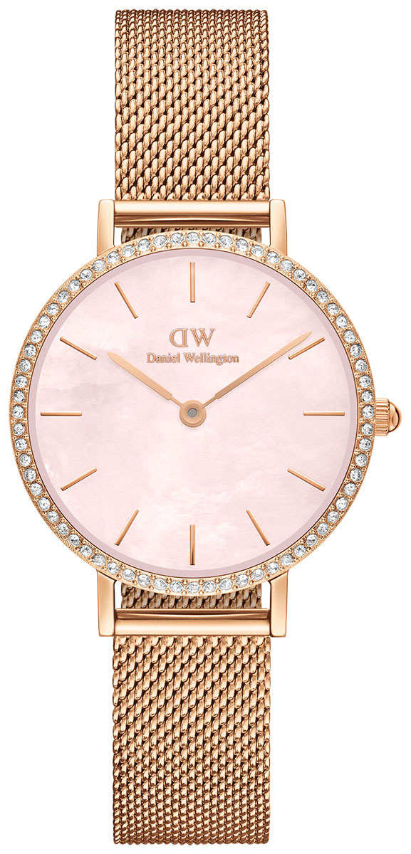 Daniel Wellington Petite 28 Stones Mesh Rosegold Pink on näyttävä naisten kello, jossa kellotaulun reunus on koristeltu kirkkailla synteettisillä zirkonioilla. Kellon 28 mm leveä runko on valmistettu ruusukullan värisestä kirurginteräksestä. Runkoon kiinnittyy ruusukullan värinen mesh-teräsranneke. Mineraalilasin alla suojassa on pinkki helmiäistaulu.Daniel Wellington Petite 28 Stones Mesh Rosegold Pink kuuluu vesitiiviysluokkaan 30m / 3atm eli se on roiskevesitiivis. Daniel Wellington -kellot toimitetaan valmistajan alkuperäisessä pakkauksessa ja niillä on kahden vuoden takuu.