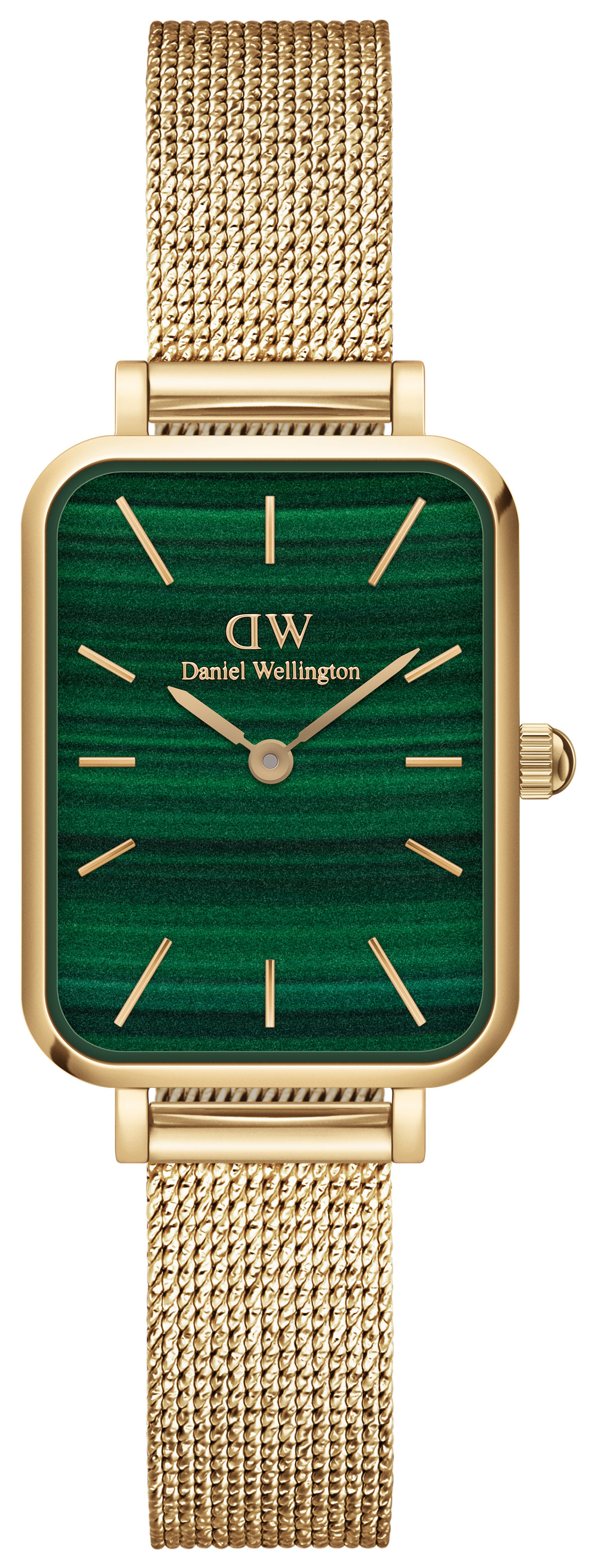 Daniel Wellington Quadro Pressed Evergold Gold Green DW00100561 on tyylikäs naisten rannekello. Rannekellon 26 mm korkea ja 20 mm leveä kullanvärinen runko on valmistettu ruostumattomasta teräksestä. Rannekkeena tässä mallissa on kullanvärinen mesh-ranneke. Mineraalilasin alla suojassa on upea vihreä kellotaulu. Daniel Wellington -kelloille myönnetään 2 vuoden takuu ja ne toimitetaan valmistajan alkuperäisessä rasiassa.