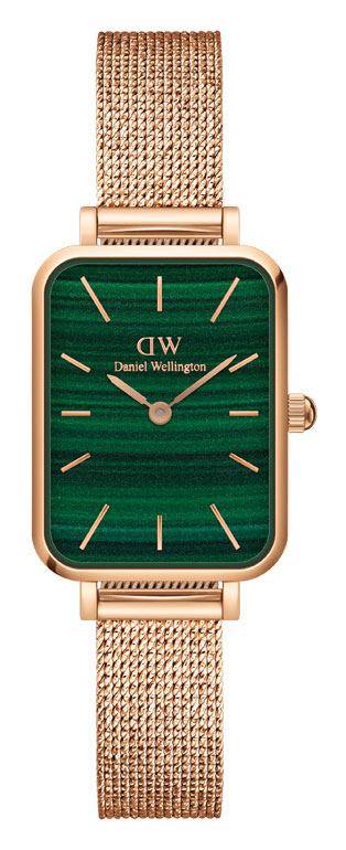 Daniel Wellington Quadro Pressed Mesh Rose Gold Green DW00100437 on elegantti naisten rannekello. Kyseessä on ensimmäinen DW-kello, jonka muotoilu on kulmikas. Daniel Wellington DW00100437 -kellon ruusukullanvärinen 20 mm leveä ja 26 mm korkea runko on valmistettu ruostumattomasta teräksestä. Kellossa on Daniel Wellingtonin uusi 10 mm leveä ruusukullanvärinen Pressed Mesh -ranneke, jonka kimalteleva tekstuuri antaa rannekkeelle tyylikästä ulkonäköä. Mineraalilasin alla suojassa on vihreä kellotaulu. Daniel Wellington -kelloille myönnetään 2 vuoden takuu ja ne toimitetaan valmistajan alkuperäisessä rasiassa.
