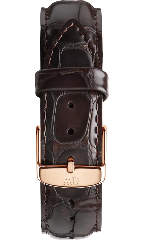 Ruskea krokokuvioinen nahkaranneke punakullan värisellä lukolla miesten Daniel wellington rannekelloon. Rannekkeen leveys 20mm. Toimitetaan postikuluitta!
