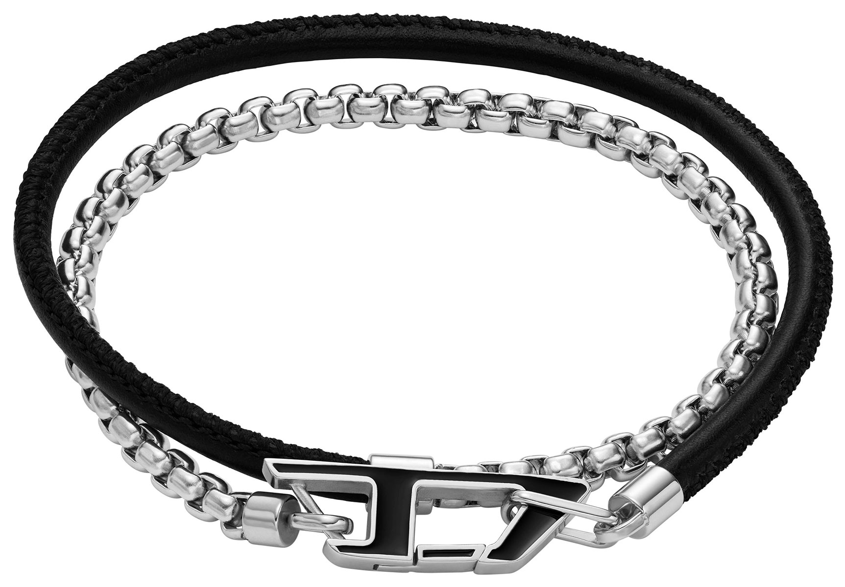 Diesel Stackables DX1472040 -rannekoru on komea yhdistelmä ruostumatonta terästä sekä mustaa nahkaa. Ketjun pituus on 417 mm. Diesel-korut toimitetaan valmistajan alkuperäisessä rasiassa.