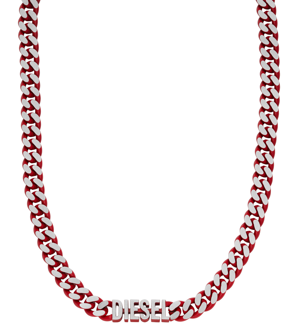 Panssariketjulla varustettu Diesel Steel kaulakoru DX1416040 on värikäs asuste miehelle. Koru on ruostumatonta terästä, ja sen pinta on pinnoitettu punaiseksi.. Korun keskellä on teksti "Diesel". Korun paksuus on 8 mm. Diesel-korut toimitetaan valmistajan alkuperäisessä rasiassa.