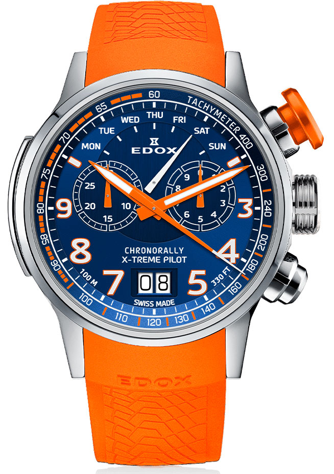 Edox Chronorally X-treme Pilot 38001-TINOCAO-BUO3 on kestävästä titaanista valmistettu miesten kvartsikoneistolla varustettu kronografikello, joka sopii ajanotto-ominaisuuksillaan erinomaisesti moniin eri urheilusuorituksiin. Kellon titaanirungon leveys on 48 mm ja paksuus 15 mm. 130 grammaa painavassa kellossa on räikeän oranssi kumiranneke, jonka leveys kiinnityskohdasta on 25 mm. Safiirilasin alla suojassa on sininen kellotaulu, jossa on ajanottoa varten kaksi alataulua, iso päivyri, sekä luminoidut indeksit ja osoittimet. Kello kuuluu vesitiiviysluokkaan 100 m / 10 atm.