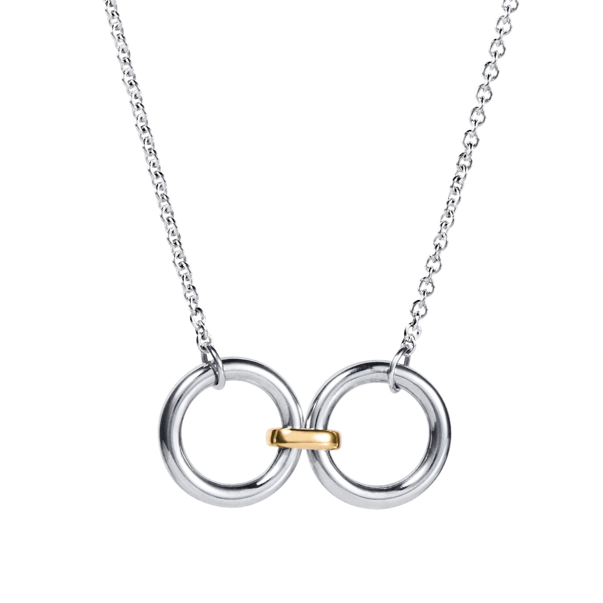 Efva Attling Divorced With Children kaulakorun 10-106-02164/4245 kahdesta yhteenliitetystä hopeasormuksesta on syntynyt kolmas kultainen lenkki, joka kuvaa lasta. Kaulakoru on kierrätettyä hopeaa, ja pienempi lenkki 18-karaatin kultaa. Riipuksen koko on 25,5 x 12,5mm, ja ketju on säädettävissä 42-45 cm pituuteen. Efva Attling -korut toimitetaan valmistajan alkuperäisessä rasiassa.