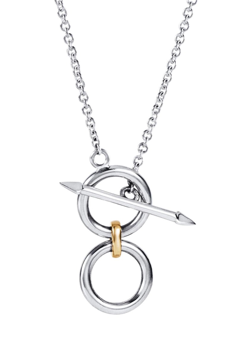 Efva Attling Divorced With Children kaulakorun II 10-106-02140/0045 kahdesta yhteenliitetystä hopeasormuksesta on syntynyt kolmas kultainen lenkki, joka kuvaa lasta. Kaulakoru on kierrätettyä hopeaa, ja pienempi lenkki 18-karaatin kultaa. Riipuksen koko on 25,5 x 12,5mm, ja ketjun pituus on 45 cm. Ketju kiinnitetään nuolilukolla. Nuolen koko: 24mm. Efva Attling -korut toimitetaan valmistajan alkuperäisessä rasiassa.