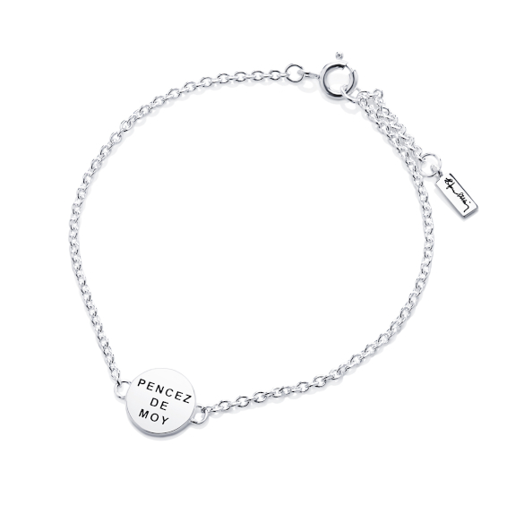 Efva Attling Mini Pencez De Moy rannekorun 14-100-00568/1719 riipuksessa lukee muinaisranskaksi Pencez De Moy, Ajattele minua. Riipuksen koko on 11 mm, ja ketju on säädettävissä 17-19 cm pituuteen. Efva Attling-korut toimitetaan valmistajan alkuperäisessä rasiassa.