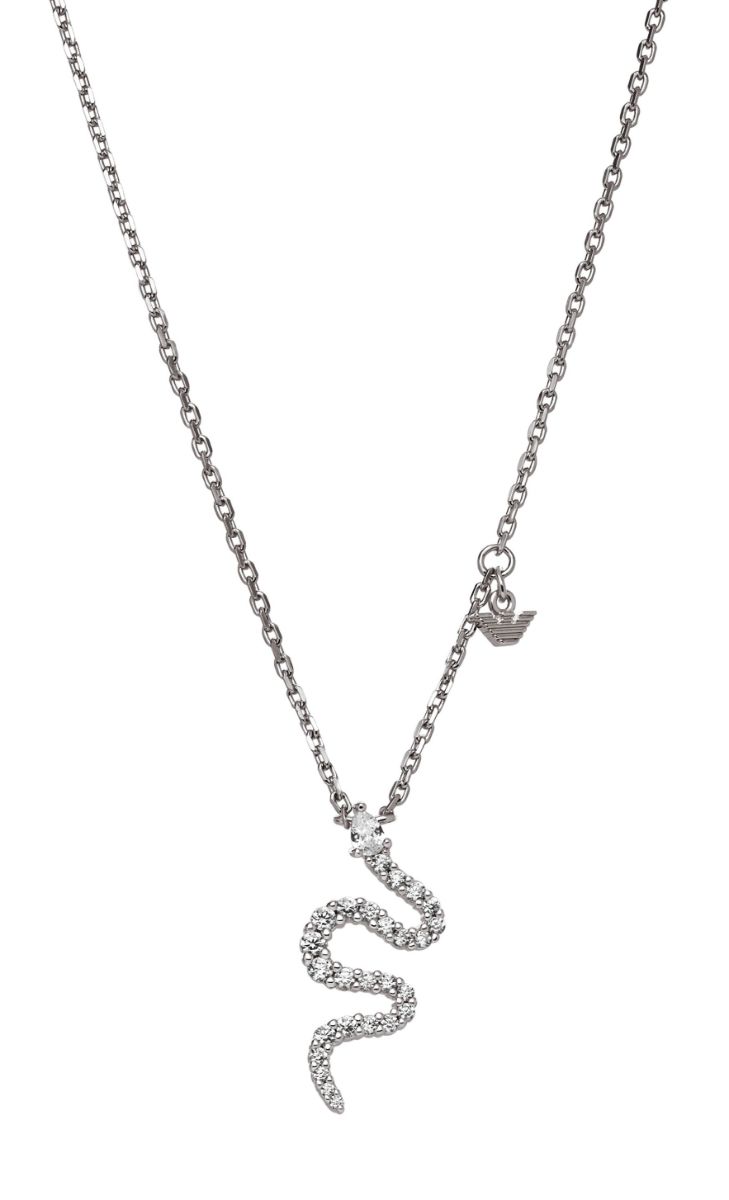 Sterling-hopeista Emporio Armani Sentimental käärmekaulakorua EG3611040 koristaa käärmeriipus. Ilmeen viimeistelee ylelliset zirkoniat riipuksen pinnassa ja hopeaketju. Käärmekorun riipuksen koko on 17,8 x 5,7 mm, ja ketjun pituus on säädettävissä välillä 42-45 cm. Emporio Armani Sentimental käärmekaulakoru EG3611040 toimitetaan valmistajan alkuperäisessä rasiassa.