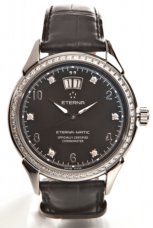 Huippulaadukaan Eterna 1948 Grande Date 8425.50.46 -rannekellon runkoon on istutettu 56 ja kellotauluun 6 aitoa timanttia. Kellon koneisto on Eterna 608, joka perustuu ETAn 2892 A2 koneistoon. Koneisto on chronometri certifioitu (COSC-certified). Kellon rungon paksuus on noin 10mm ja leveys 39mm ilman nuppia. Nupin kanssa leveys on 42mm. Kellolla on kahden vuoden takuu ja se toimitetaan tyylikkäässä puusta valmistetussa rasiassa kaikkien alkuperäisten dokumenttien kanssa.