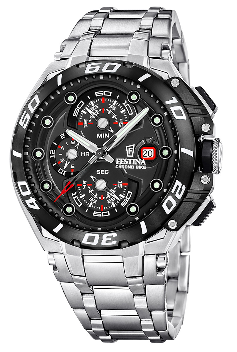 Festina Chronobike F20754/6 on dynaaminen voimanpesä, joka edustaa malliston klassisinta ja samalla puhuttelevinta värimaailmaa. Tässä mallissa syvänmusta kellotaulu ja siihen sointuva musta kehä muodostavat tyylikkään ja maskuliinisen kokonaisuuden harjatulle 316L-ruostumattomalle teräkselle. Sähäkät punaiset yksityiskohdat kronografin osoittimissa ja päivyrin kehyksessä korostavat kellon urheilullista luonnetta ja takaavat tarkan luettavuuden.