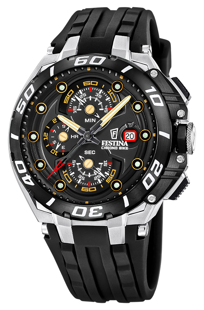 Festina Chronobike F20755/8 on dynaaminen kronografi, joka on suunniteltu aktiiviseen elämäntyyliin, jossa vaaditaan sekä tyyliä että äärimmäistä suorituskykyä. Tässä vuoden 2026 malliston erikoisuudessa yhdistyvät vankka 316L-ruostumaton teräsrunko ja kestävä, musta kumiranneke. Syvänmusta kellotaulu ja kehä luovat voimakkaan kontrastin keltaisille ja punaisille yksityiskohdille, jotka on poimittu suoraan kilpapyöräilyn sähäkästä maailmasta.