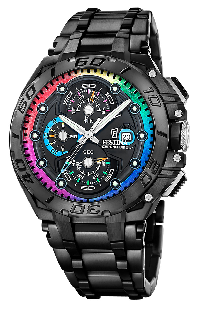 Festina Chronobike Limited Edition F20754/1 on kokoelman kruununjalokivi, jota on valmistettu vain 3 000 kappaletta maailmanlaajuisesti. Tämä kello on täydellinen yhdistelmä Festinan pyöräilyperintöä, huippuluokan innovaatiota ja voimakasta urheilullista identiteettiä. Kellon vaikuttavin piirre on sen musta, PVD-pinnoitettu ulkoasu, jota elävöittää upea, sateenkaaren väreissä hehkuva sisäkehä. Värikkäät yksityiskohdat alatauluissa tekevät tästä kellosta todellisen katseenvangitsijan, joka ei jää huomaamatta.