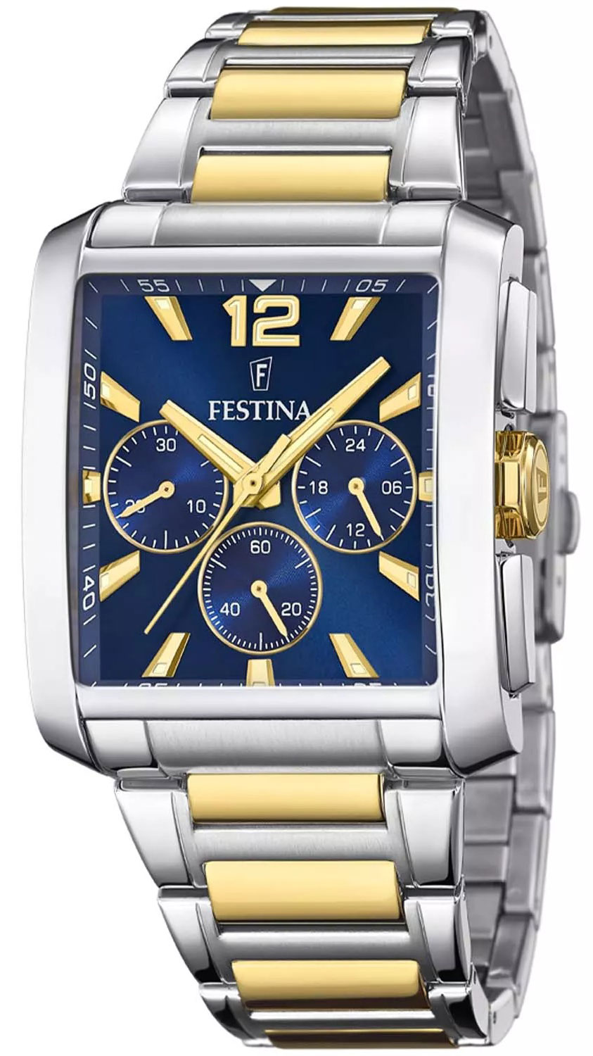 Festina On the Square Chronograph F20637/1 on hopeansävyinen ja suorakulmion mallinen kronografikello, joka on sekä elegantti että toiminnallinen. Tämä kvartsikoneistolla varustettu rannekello on valmistettu ruostumattomasta teräksestä, ja jonka rungon leveys on 37 mm. Mineraalilasi suojaa sinistä kellotaulua, jossa on alataulut ajanotolle sekä luminoidut viisarit ja indeksit auttamassa lukemaan kellotaulua pimeässä. Kaksivärisen teräsrannekkeen leveys on 29 mm. Festina On the Square Chronograph F20637/1 kuuluu vesitiiviysluokkaan 50m / 5atm eli se on rajoitetusti vesitiivis (uintia ei suositella).