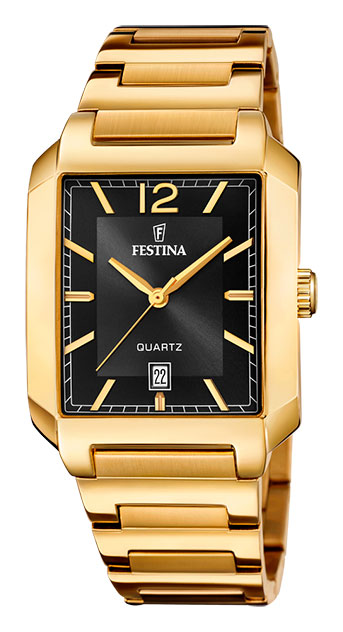 Festina On The Square gents F20678/4 miesten rannekellossa on japanilainen Miyota Gr12-koneisto ja erottuva neliönmuotoinen kellotaulu, joka yhdistää eleganssia ja klassista muotoilua. Kullanvärisen rungon leveys on 40,5 mm ja paksuus 9 mm. Ruostumattomasta teräksestä valmistetun kullanvärisen rannekkeen pituus on 145 - 210 mm ja leveys kiinnityskohdasta 25 mm. Kellossa on musta mineraalilasilla suojattu kellotaulu, jossa on päivyri, viivaindeksit ja numeroindeksi klo 12 kohdalla. Festina F20678/4 kellon vesitiiveysluokitus on 50m / 5atm eli se on rajoitetusti vesitiivis (uintia ei suositella).