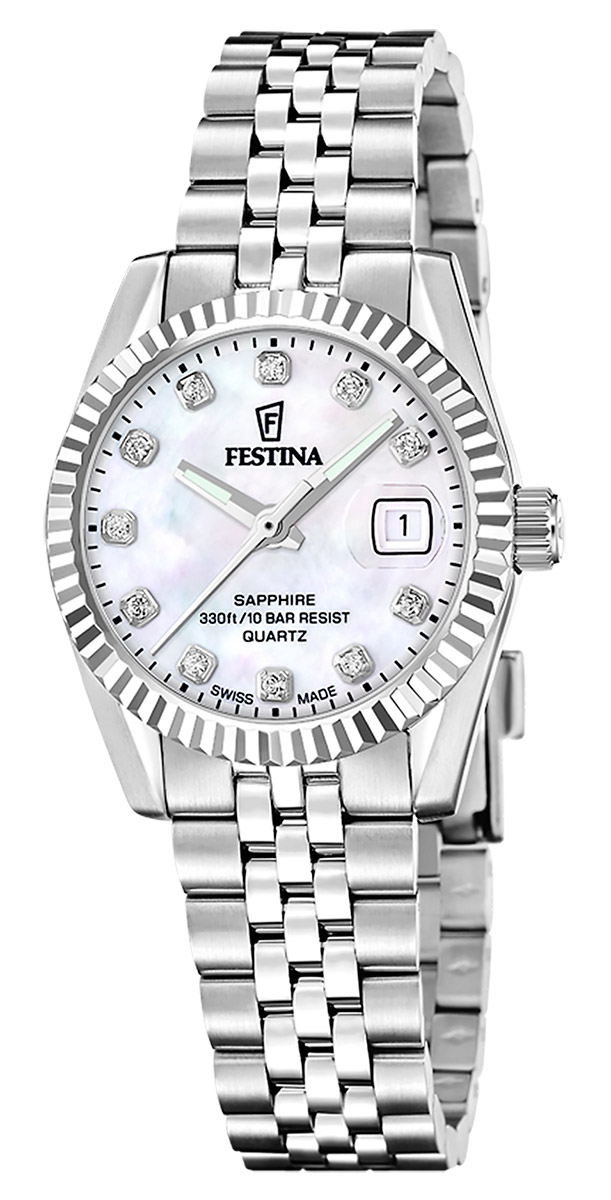 Festina Swiss Classic F20087/1 on hienostunut naisten kello, jossa yhdistyvät korumainen siro muotoilu ja aito sveitsiläinen kellonvalmistusperinne. Kellon todellinen katseenvangitsija on upea helmiäistaulu (nacre), jota koristavat säihkyvät indeksit. Tyylitellyllä uritetulla kehällä varustettu 29 mm runko on valmistettu kestävästä 316L-teräksestä, ja se istuu kauniisti kapeampaankin ranteeseen.