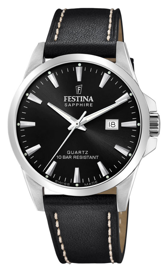 Festina Swiss Made F20025/4 on tyylikäs miesten kello, jonka ruostumattomasta teräksestä valmistettu 41 mm leveä ja 9 mm paksu runko on hopeanvärinen. Rannekkeena tässä mallissa on musta nahkaranneke, jonka leveys kiinnityskohdasta on 21 mm. Kellon ominaisuuksiin kuuluu päivyri. Festina F20025/4 -kellon mustaa kellotaulua suojaa safiirilasi. Kello kuuluu vesitiiviysluokkaan 100m / 10atm eli se on vesitiivis. Soveltuu pintauintikäyttöön ja snorkkelisukellukseen, ei laitesukellukseen. Festina-kellot toimitetaan valmistajan alkuperäisessä pakkauksessa ja niillä on kahden vuoden takuu.