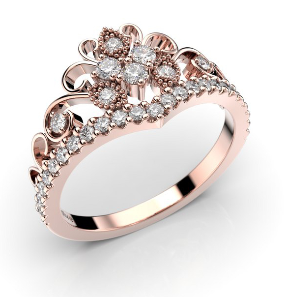 Festive Donna 564-035-PK-timanttisormuksessa on ainutlaatuinen ilme, jossa yhdistyy v:n mallinen onnea tuova toivomusluu-chevron-runko näyttäviin filigraanista inspiraationsa saaneeseen kuviointiin ja uskollisuutta symboloivaan kruunumalliin. Sormuksen keskustaa koristaa kahdeksan suurempaa briljanttihiottua timanttia, ja istutus jatkuu v:n mallisessa rungossa, jossa on 23 pienempää timanttia. Jalokivet on hiottu perinteisellä briljantti-hionnalla, joka korostaa timanttien kirkkautta ja loistoa.