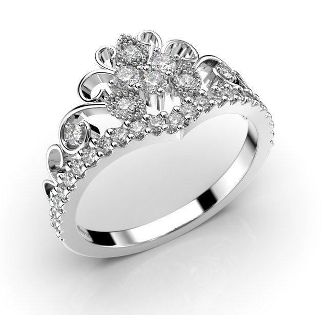 Festive Donna 564-035-VK-timanttisormuksessa on ainutlaatuinen ilme, jossa yhdistyy v:n mallinen onnea tuova toivomusluu-chevron-runko näyttäviin filigraanista inspiraationsa saaneeseen kuviointiin ja uskollisuutta symboloivaan kruunumalliin. Sormuksen keskustaa koristaa kahdeksan suurempaa briljanttihiottua timanttia, ja istutus jatkuu v:n mallisessa rungossa, jossa on 23 pienempää timanttia. Jalokivet on hiottu perinteisellä briljantti-hionnalla, joka korostaa timanttien kirkkautta ja loistoa.