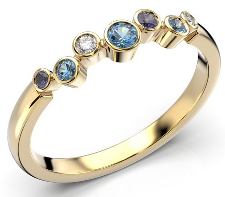 Kotimainen Festive Drop Blue timanttivärikivisormuksessa 644-015B-KK hehkuu jalokivet kuin pisarat kesäisen järven pinnalla. Sormuksen 2 mm leveään runkoon on istutettu useita erikokoisia timantteja (0,02 + 0,01 ct), topaaseja (0,05 + 2 x 0,02 ct) ja sinisafiireja (0,02 + 0,01 ct). Käytä yksinään tai yhteensopivan rivisormuksen kanssa.