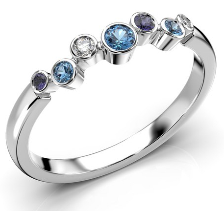 Kotimainen Festive Drop Blue timanttivärikivisormuksessa 644-015B-VK hehkuu jalokivet kuin pisarat kesäisen järven pinnalla. Sormuksen 2 mm leveään runkoon on istutettu useita erikokoisia timantteja (0,02 + 0,01 ct), topaaseja (0,05 + 2 x 0,02 ct) ja sinisafiireja (0,02 + 0,01 ct). Käytä yksinään tai yhteensopivan rivisormuksen kanssa.