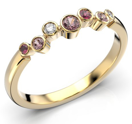 Kotimainen Festive Drop Pink timanttivärikivisormuksessa 644-015P-KK hehkuu jalokivet kuin pisarat. Sormuksen 2 mm leveään runkoon on istutettu useita erikokoisia timantteja (0,02 + 0,01 ct), vaaleanpunaisia safiireja (0,05 + 2 x 0,02 ct), ja rubiineja (0,02 + 0,01 ct). Käytä yksinään tai yhteensopivan rivisormuksen kanssa.