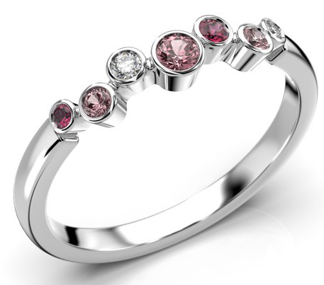 Kotimainen Festive Drop Pink timanttivärikivisormuksessa 644-015P-VK hehkuu jalokivet kuin pisarat. Sormuksen 2 mm leveään runkoon on istutettu useita erikokoisia timantteja (0,02 + 0,01 ct), vaaleanpunaisia safiireja (0,05 + 2 x 0,02 ct), ja rubiineja (0,02 + 0,01 ct). Käytä yksinään tai yhteensopivan rivisormuksen kanssa.