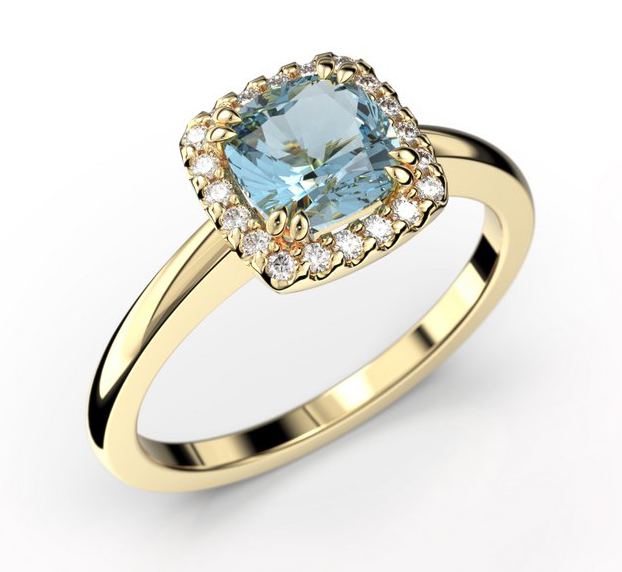 Festive Elsa 587-090A-KK -akvamariinitimanttisormuksessa on klassinen halo-istutus, jonka keskiössä on suuri vedensininen cushion-hiottu 0,80 karaatin akvamariini, ja akvamariinia reunustaa 20 pienempää 0,005 karaatin timanttia. Ainutlaatuisen ilmeen viimeistelee pisaranmuotoiset tuplakynnet, jolla akvamariini on kiinnitetty. Rungon flakkamalli on miellyttävä sormessa, ja rungon leveys on 1,9 mm. Istutuksen kohdalta sormuksen leveys on 8,3 mm.
