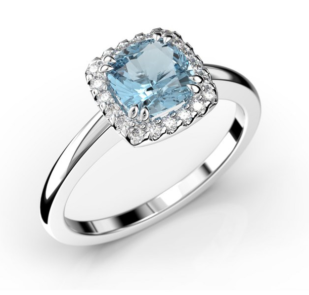 Festive Elsa 587-090A-VK -akvamariinitimanttisormuksessa on klassinen halo-istutus, jonka keskiössä on suuri vedensininen cushion-hiottu 0,80 karaatin akvamariini, ja akvamariinia reunustaa 20 pienempää 0,005 karaatin timanttia. Ainutlaatuisen ilmeen viimeistelee pisaranmuotoiset tuplakynnet, jolla akvamariini on kiinnitetty. Rungon flakkamalli on miellyttävä sormessa, ja rungon leveys on 1,9 mm. Istutuksen kohdalta sormuksen leveys on 8,3 mm.