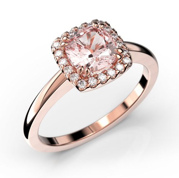 Festive Elsa 587-090M-PK -morganiittitimanttisormuksessa on klassinen halo-istutus, jonka keskiössä on suuri vaaleanpunainen cushion-hiottu 0,80 karaatin morganiitti, ja suurta kiveä reunustaa 20 pienempää 0,005 karaatin timanttia. Ainutlaatuisen ilmeen viimeistelee pisaranmuotoiset tuplakynnet, jolla morganiitti on kiinnitetty. Rungon flakkamalli on miellyttävä sormessa, ja rungon leveys on 1,9 mm. Istutuksen kohdalta sormuksen leveys on 8,3 mm.