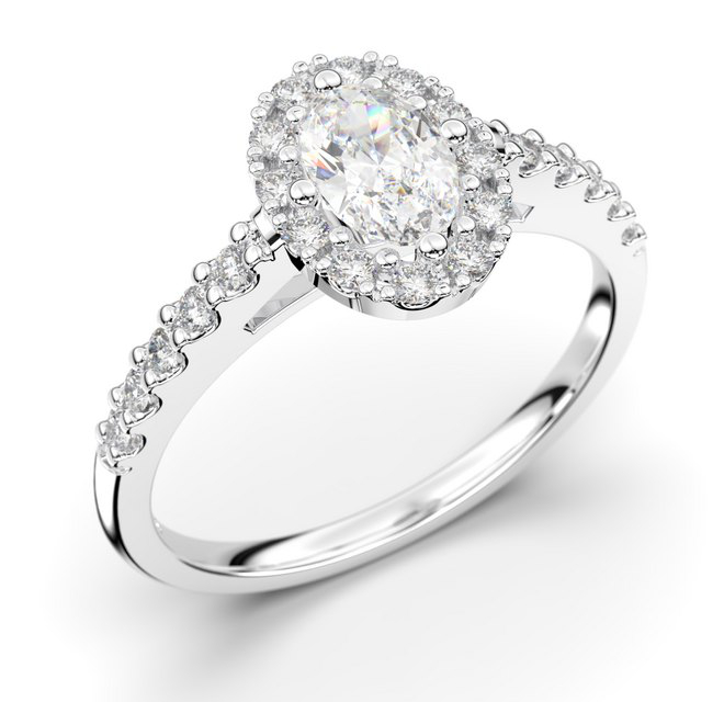 Festive Evelyn 577-072-VK on hurmaavan kaunis halo-timanttisormus, jonka keskustaa koristaa ovaalinmuotoinen briljattihiottu 0,50 karaatin wesselton-timantti. Timanttia kehystää 10 0,01 karaatin timanttikehä ja istutus jatkuu vielä sormuksen rungossa viimeistellen tämän klassisen kokonaisuuden. Sormuksen rungon paksuus on 1,5 mm, ja hento tynnyriflakkamalli istuu miellyttävästi sormessa. Istutuksen kohdalta leveys on 9 mm. Sormusta voi käyttää yksinään tai yhdistää toiseen sormukseen juuri itselle sopivan kokonaisuuden luomiseksi.