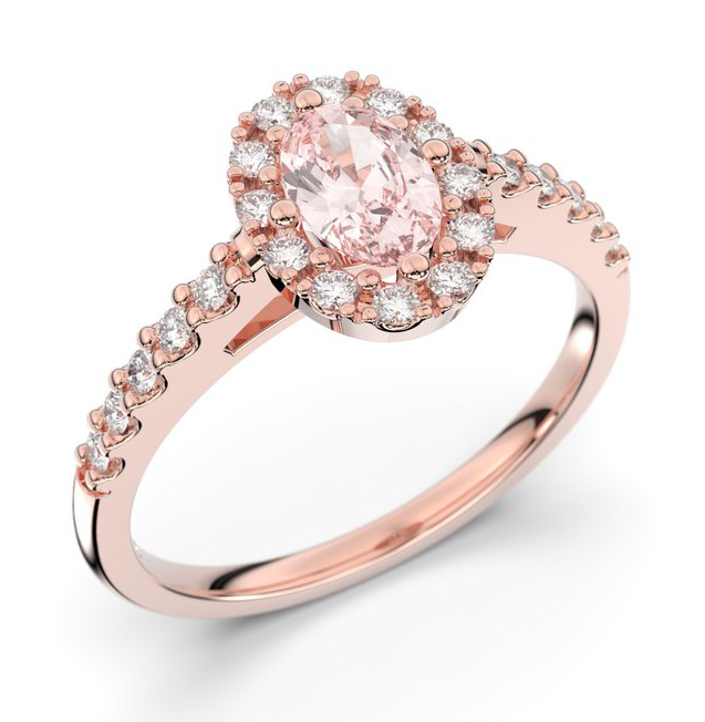 Festive Evelyn 577-072M-PK on hurmaavan kaunis halo-morganiittitimanttisormus, jonka keskelle asetettu ovaalinmuotoinen briljattihiottu 0,50 karaatin vaaleanpunainen morganiitti säihkyy kauniisti rungon ruusukultaa vasten. Morganiittia kehystää 10 0,01 karaatin kirkasta timanttia, ja istutus jatkuu vielä sormuksen rungossa viimeistellen tämän klassisen kokonaisuuden. Sormuksen rungon paksuus on 1,5 mm, ja hento tynnyriflakkamalli istuu miellyttävästi sormessa. Istutuksen kohdalta leveys on 9 mm. Sormusta voi käyttää yksinään tai yhdistää toiseen sormukseen juuri itselle sopivan kokonaisuuden luomiseksi.