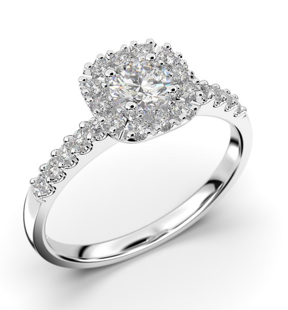 Festive Josefiina 597-052-VK-halo-timanttisormusta koristaa tyylikkään moderni nelikulmainen kivi-istutus ja 23 upeaa briljanttihiottua timanttia. Istuksen keskellä on suurempi 0,30 karaatin timantti, jota reunustaa 12 kappaletta 0,01 karaatin pienempää timanttia, ja istutus jatkuu edelleen 10:nen 0,01 karaatin timantin muodossa sormuksen flakkarungossa täydellisen säihkeen takaamiseksi. Halo-mallinen Josefiina on upea yksinään, ja se on helppo myös yhdistää myös muihin sormuksiin, ja rakentaa juuri itselle sopiva kokonaisuus.