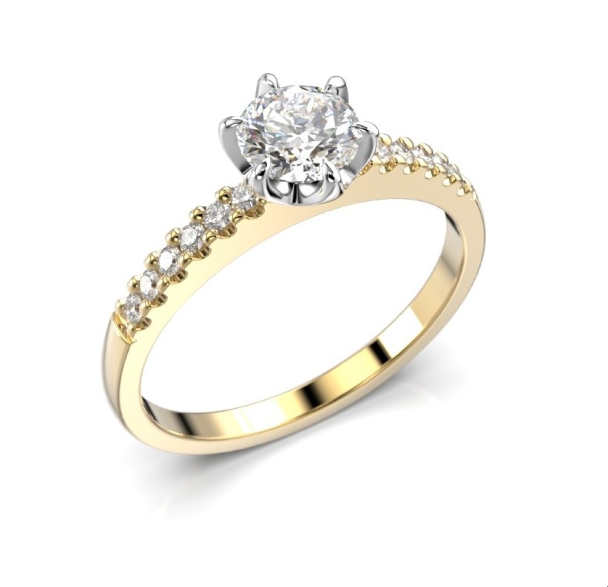 Festive Julianna Kruunu timanttisivukivisormus 0,62 ct keltavalkokulta 0,62 ct 682-062-KV on ajaton ja elegantti sivukivisormus, jota koristaa 12 0,01 karaatin timanttia ja yksi suurempi 0,50 karaatin timantti. Rungon materiaalina on käytetty (valintasi mukaan 14K tai 18K) keltakultaa, ja flakkamallin reunat on kevyesti pyöristetty, jolloin sormus istuu tukevasti ja pehmeästi sormessa. Sormuksen leveys on 1,9 mm. Istutuksen kohdalta sormuksen koko on 5,6 mm. Keskikiven kynnessä on käytetty valkokultaa. Julianna-sormuksesta on saatavana myös ruusu- ja valkokultaversio.