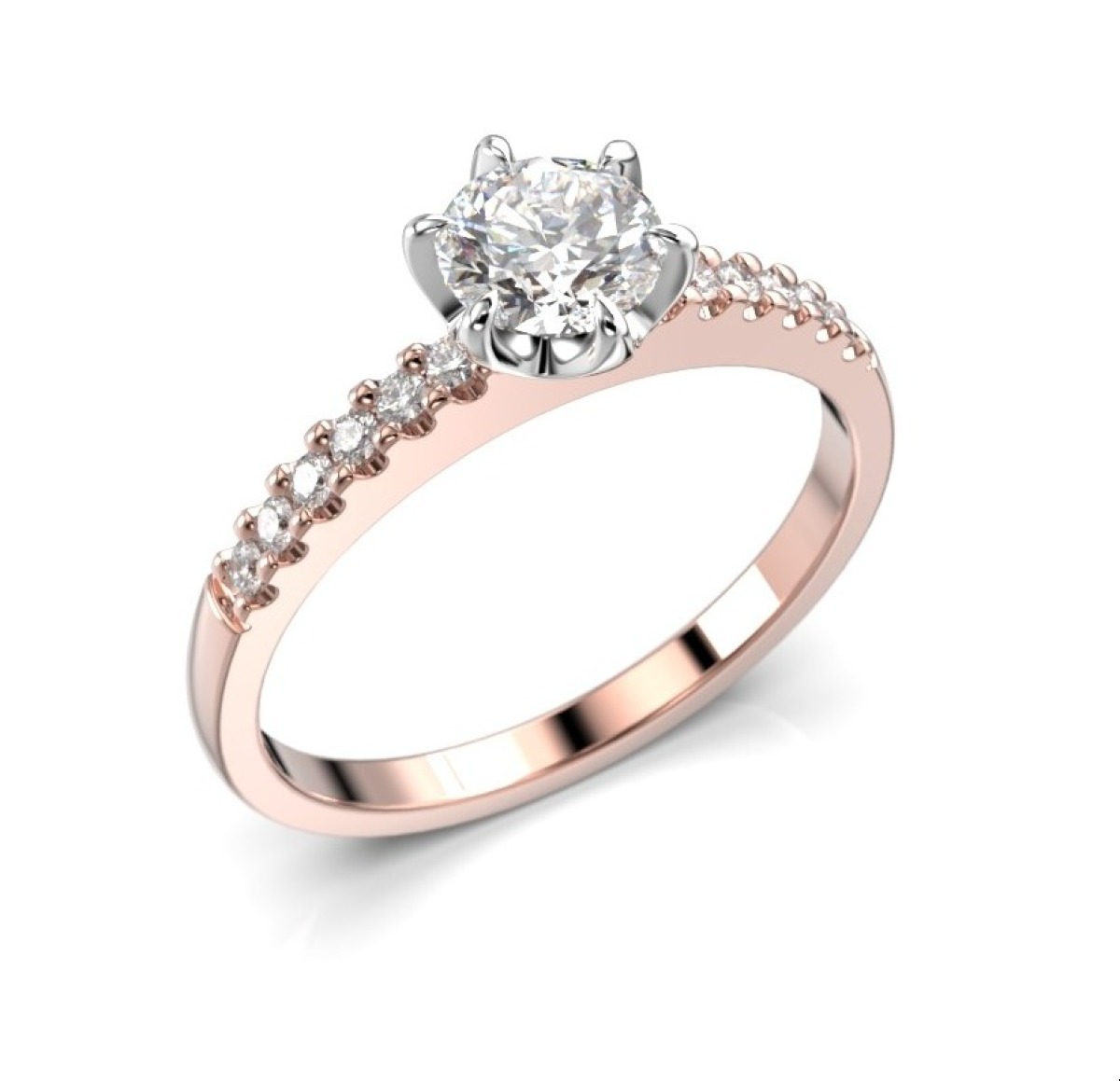 Festive Julianna Kruunu timanttisivukivisormus 0,62 ct ruusuvalkokulta 682-062-PV on ajaton ja elegantti sivukivisormus, jota koristaa 12 0,01 karaatin timanttia ja yksi suurempi 0,50 karaatin timantti. Rungon materiaalina on käytetty (valintasi mukaan 14K tai 18K) ruusukultaa, ja flakkamallin reunat on kevyesti pyöristetty, jolloin sormus istuu tukevasti ja pehmeästi sormessa. Sormuksen leveys on 1,9 mm. Istutuksen kohdalta sormuksen koko on 5,6 mm. Keskikiven kynnessä on käytetty valkokultaa. Julianna-sormuksesta on saatavana myös kelta- ja valkokultaversio.