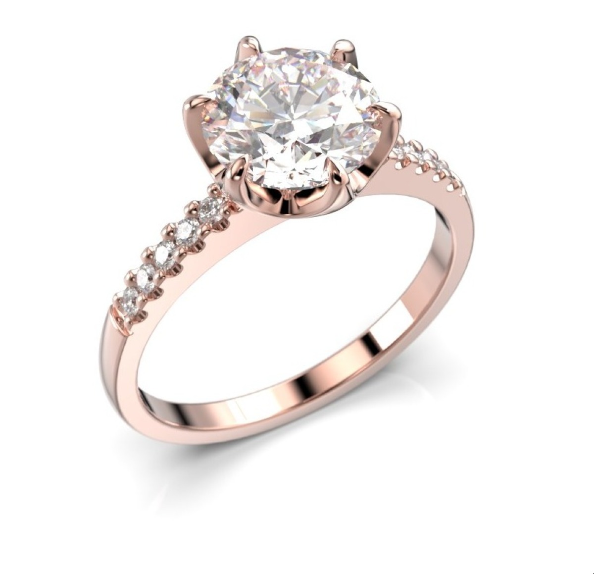 Festive Julianna timanttisormus 1,60 ct sivukivellinen kruunu ruusukulta 682-160-PK on näyttävä ja elegantti sivukivisormus, jota koristaa 10 0,01 karaatin timanttia ja yksi suuri 1,50 karaatin timantti. Rungon materiaalina on käytetty (valintasi mukaan 14K tai 18K) ruusukultaa, ja flakkamallin reunat on kevyesti pyöristetty, jolloin sormus istuu tukevasti ja pehmeästi sormessa. Sormuksen leveys on 1,9 mm. Istutuksen kohdalta sormuksen koko on 8,1 mm. Julianna-sormuksesta on saatavana myös kelta- ja valkokultaversio.