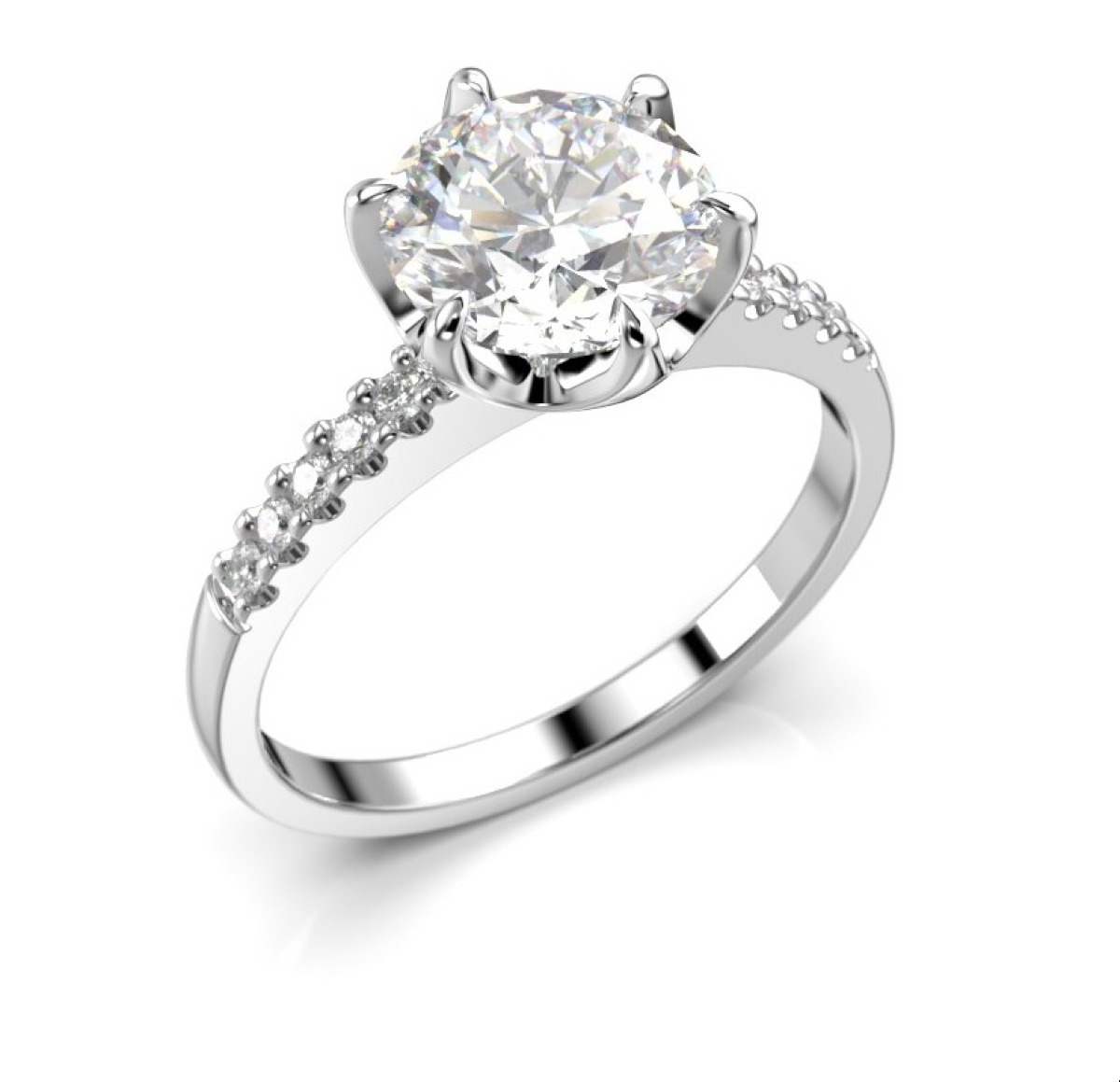 Festive Julianna timanttisormus 1,60 ct sivukivellinen kruunu valkokulta 682-160-VK on näyttävä ja elegantti sivukivisormus, jota koristaa 10 0,01 karaatin timanttia ja yksi suurempi 1,50 karaatin timantti. Rungon materiaalina on käytetty (valintasi mukaan 14K tai 18K) ruusukultaa, ja flakkamallin reunat on kevyesti pyöristetty, jolloin sormus istuu tukevasti ja pehmeästi sormessa. Sormuksen leveys on 1,9 mm. Istutuksen kohdalta sormuksen koko on 8,1 mm. Julianna-sormuksesta on saatavana myös kelta- ja ruusukultaversio.